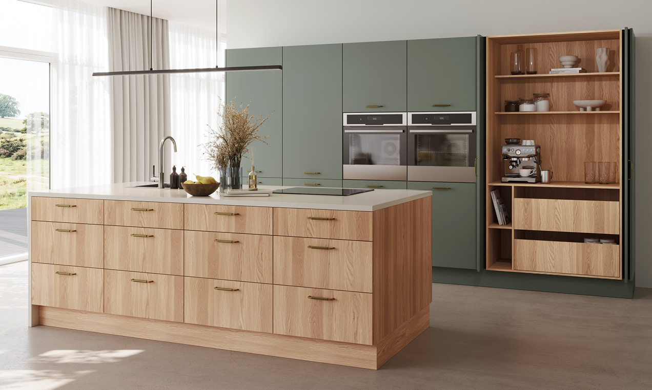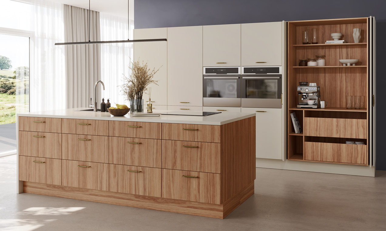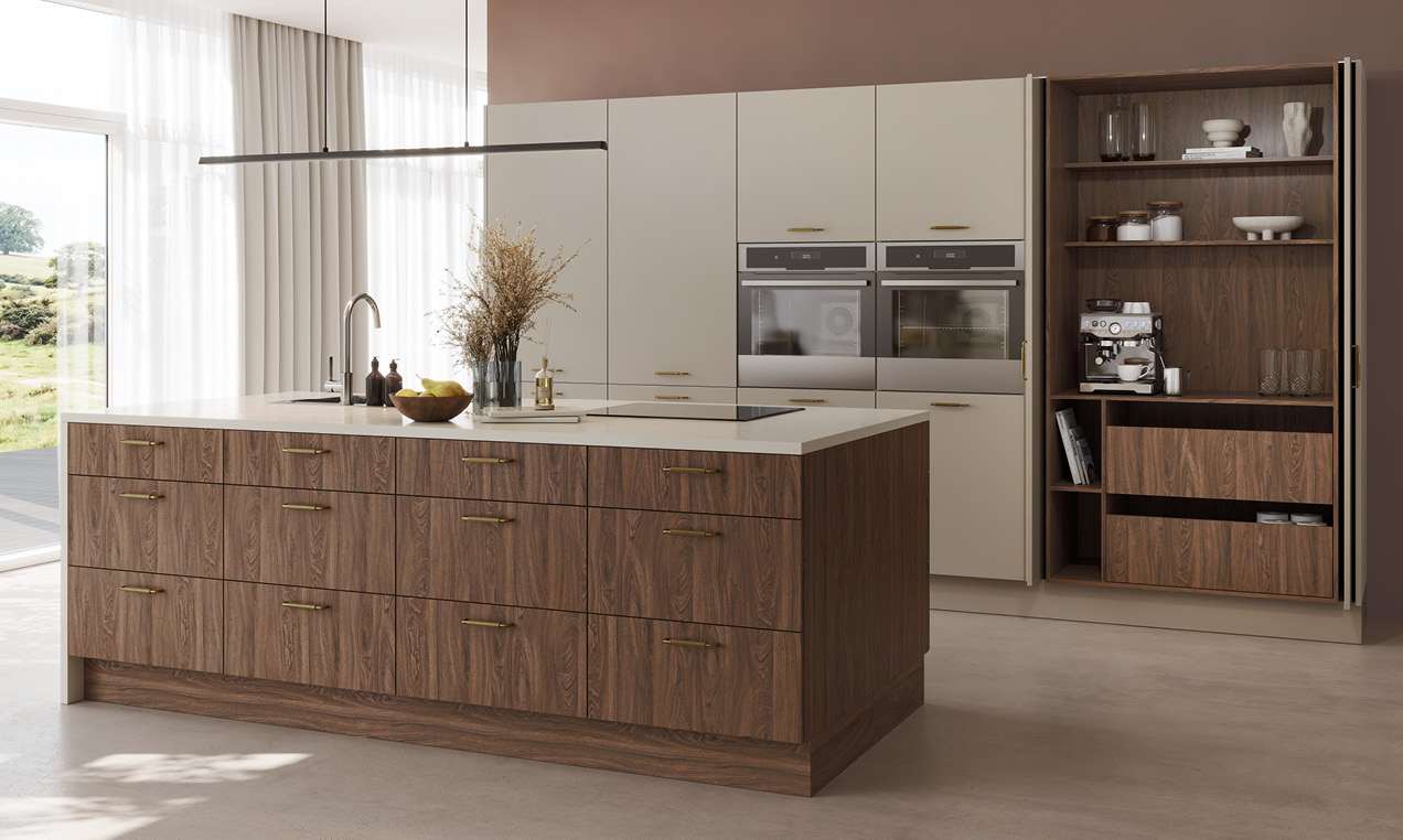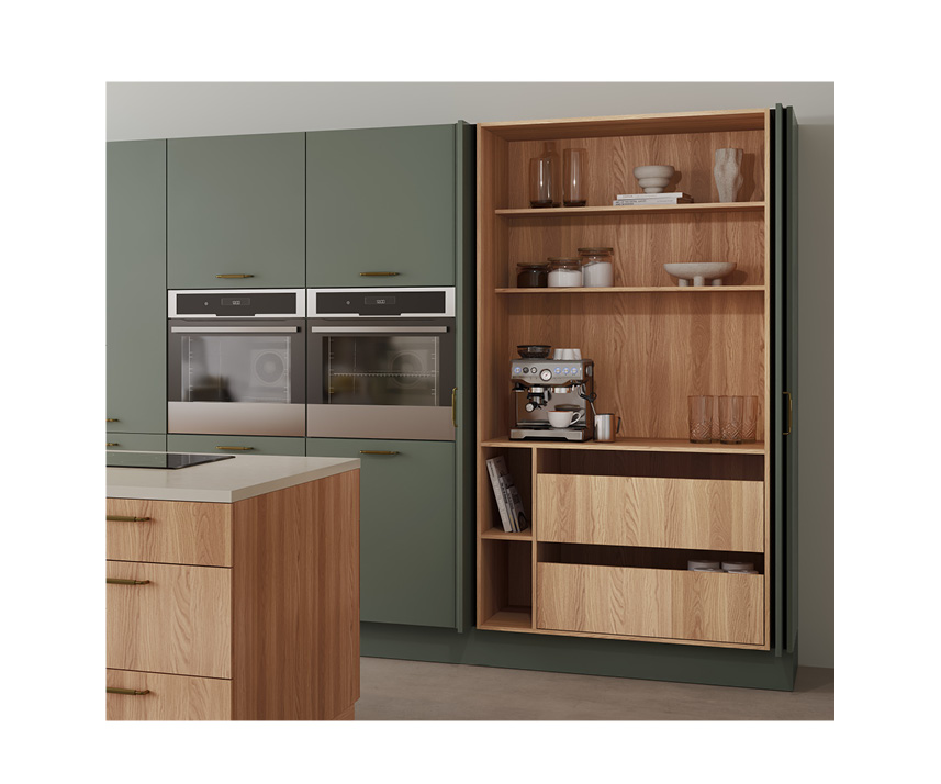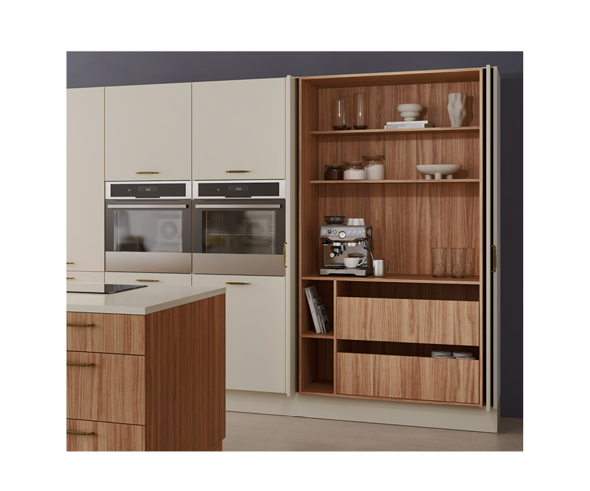 Pocket Doors skabsløsningKomplet løsning i populære materialer.Med vores Pocket Doors løsning leverer vi et færdigforberedt skab, hvor vi har tænkt detaljerne igennem på forhånd. Skabet leveres komplet med indvendigt skab, fronter, gavle og udtræksskinner (ekskl. skuffesæt og greb) - klar til montering uden behov for yderligere tilpasning. Skabet er forberedt til standard bredde skuffer. Det indvendige skab leveres i vores Dekor Syncron i Elm, Lys Valnød eller Røget Eg. Fronter og gavle tilbydes i SetaLac eller IXTEX serien. Alle komponenter er forarbejdet, så Pocket Doors fungerer optimalt fra første dag.